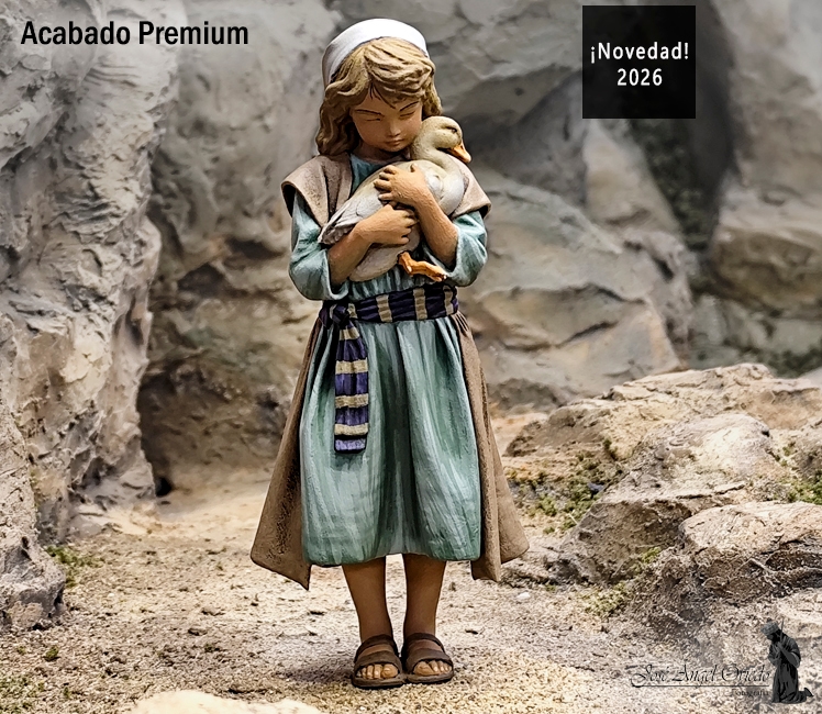 Niña con vestimenta hebrea, ropón y cíngulo de rayas que abraza un patito en su pecho. La figura tiene una gran ternura tanto en la expresión de la niña como en la interpretación de la pieza con el abrazo al animalito. Ideal para cualquier rincón de tu Belén, además, puedes completar la escena con los patos que se han realizado para la misma y que podéis encontrar más abajo en el catálogo.